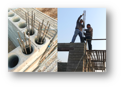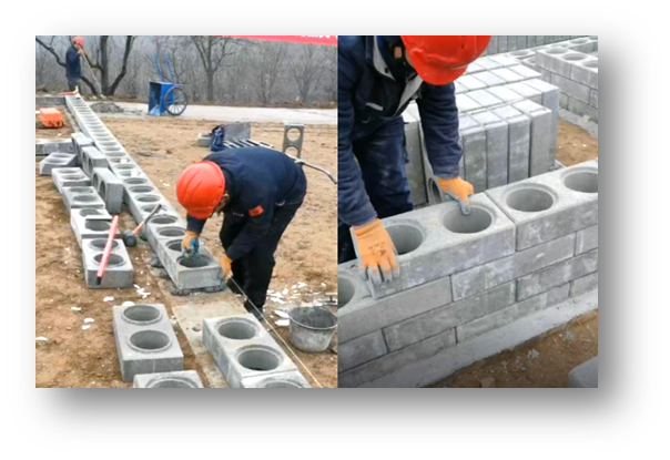 按照墻體建筑最小模塊240*240尺寸標(biāo)準(zhǔn)進(jìn)行地基施工,在建筑所有需要承重部位預(yù)留內(nèi)置框架插入節(jié)點(diǎn)柱子孔位。每個孔位都和砌體模塊中心圓孔重合,便于隱形框架植入施工。